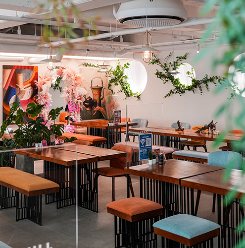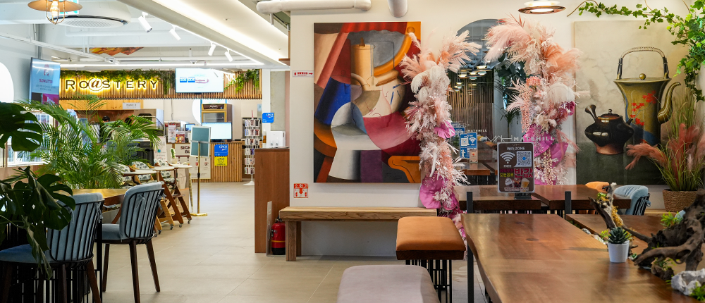 고객의 시선을 끄는 캔버스 액자와 Wains coating을 사용하여 여유로운 공간을 연출합니다.